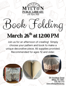 Book Folding 12:00 pm – 1:00 pmMarch 26, 2026 The Milton Public Library541 BroadwayMilton , Pennsylvania 17847View LocationMap The Milton Public Library iCal Google Calendar View full calendar