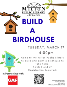 Build A Birdhouse 4:30 pm – 5:30 pmMarch 17, 2026 The Milton Public Library541 BroadwayMilton , Pennsylvania 17847View LocationMap The Milton Public Library iCal Google Calendar View full calendar