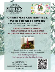 Christmas Centerpiece with Fresh Flowers 4:00 pm – 5:00 pmDecember 20, 2025 The Milton Public Library541 BroadwayMilton , Pennsylvania 17847View LocationMap The Milton Public Library iCal Google Calendar View full calendar