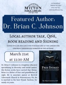 Featured Author Visit: Dr. Brian C Johnson 11:30 am – 12:30 pmMarch 21, 2026 The Milton Public Library541 BroadwayMilton , Pennsylvania 17847View LocationMap The Milton Public Library iCal Google Calendar View full calendar