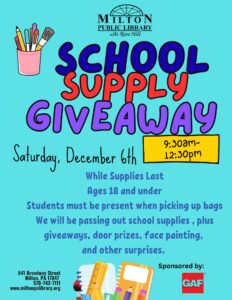 School Supply Giveaway 9:30 am – 12:30 pmDecember 6, 2025 The Milton Public Library541 BroadwayMilton , Pennsylvania 17847View LocationMap The Milton Public Library iCal Google Calendar View full calendar