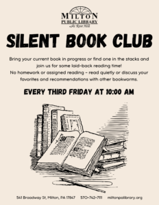 Silent Book Club 10:00 am – 11:00 amApril 17, 2026 The Milton Public Library541 BroadwayMilton , Pennsylvania 17847View LocationMap The Milton Public Library iCal Google Calendar View full calendar