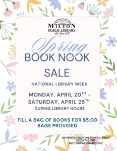 Spring Book Nook Sale 9:00 am – 6:00 pmApril 23, 2026 The Milton Public Library541 BroadwayMilton , Pennsylvania 17847View LocationMap The Milton Public Library iCal Google Calendar View full calendar