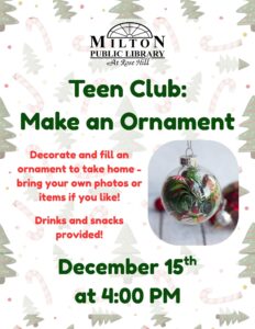 Teen Club: Winter Decoration 4:00 pm – 5:00 pmDecember 15, 2025 The Milton Public Library541 BroadwayMilton , Pennsylvania 17847View LocationMap The Milton Public Library iCal Google Calendar View full calendar